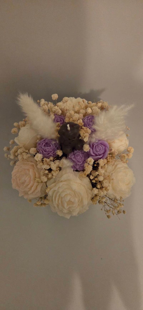 Cet ensemble se compose de fleurs en cire délicatement parfumées, fabriqués à la main à partir de cire végétale de soja et de fragrance de Grasse, le tout étant sublimé par des fleurs séchées